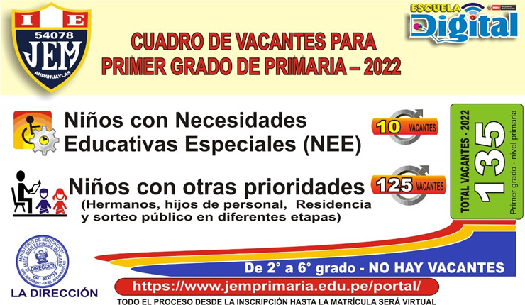 VACANTES PARA PRIMER GRADO DE PRIMARIA - 2022Publicado: 27 Diciembre 2021 | Escrito por Super User | Imprimir | Visto: 842 Anterior Siguiente